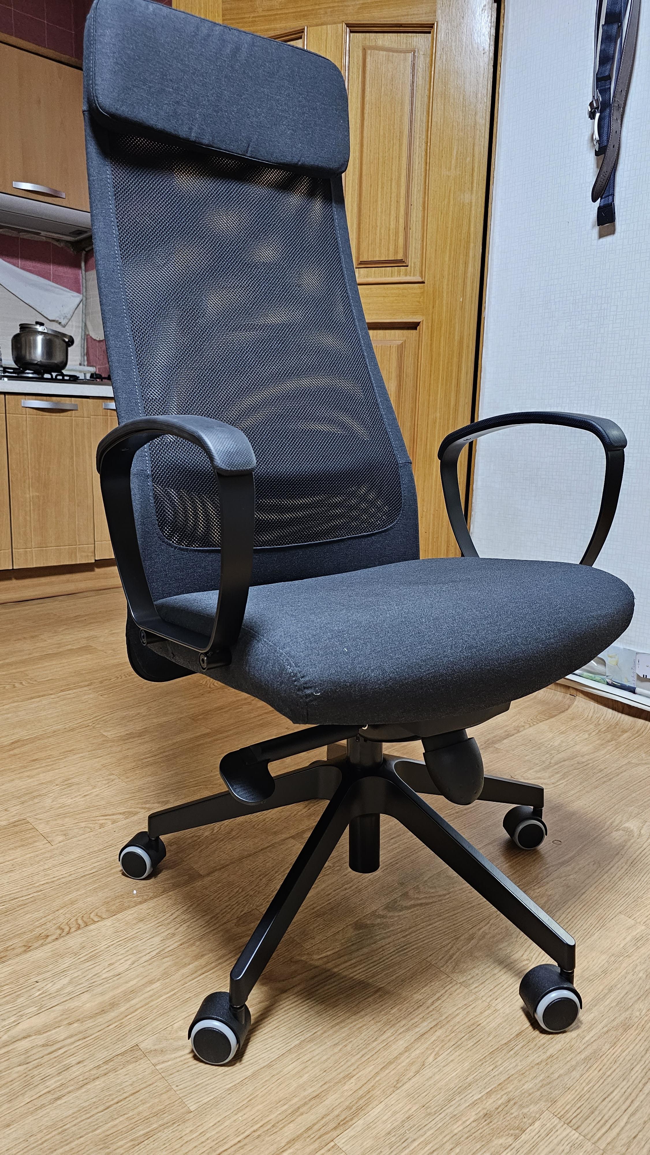 고양 이케아에서 이런 저런 의자를 앉아보다 고른 것이 마르쿠스라는 사무용 의자이다. 가격은 시디즈 T50에서의 절반 정도이고 비교해서 기능이 많지는 않지만 앉았을 때 아주 편했고 뒤로 젖혀도 발의 높이가 높아지지 않아 편하게 느꼈다.