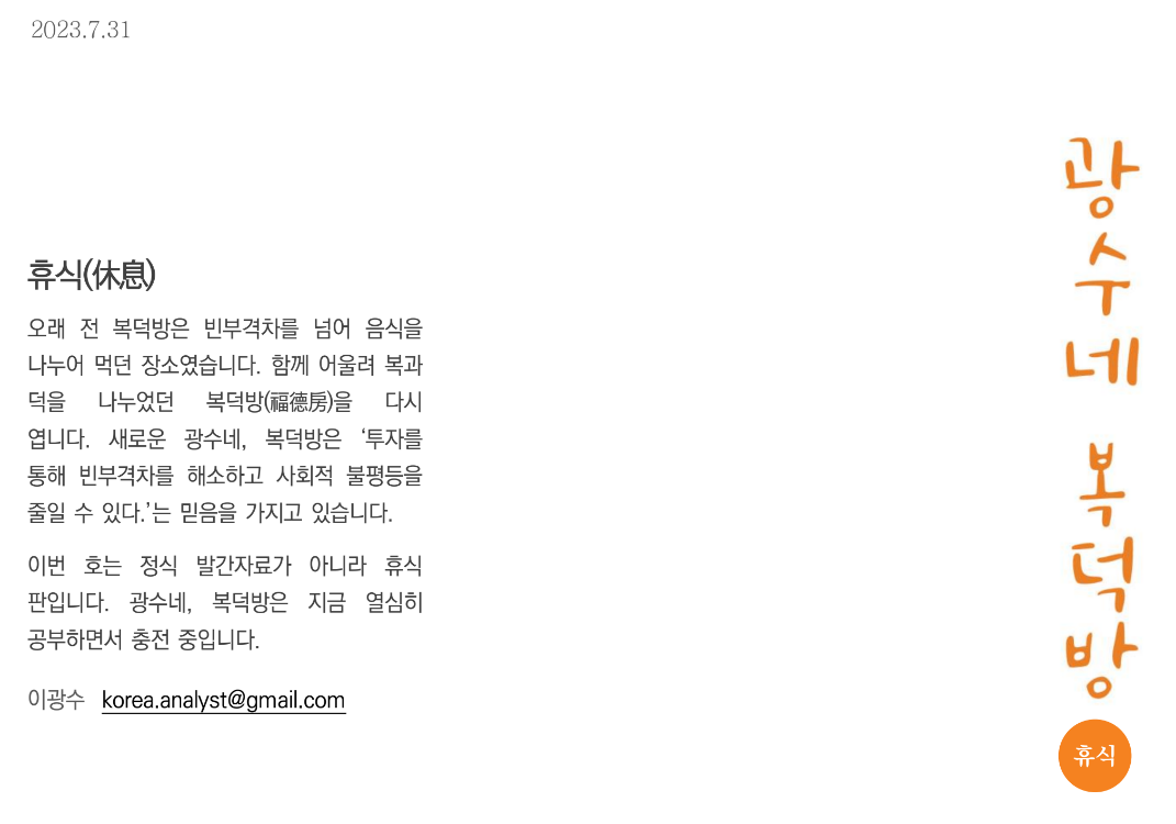 참고로 구독을 하고 싶으면 korea.analyst@gmail.com 이메일 주소로 신청 메일을 보내면 된다. 구독은 무료이고 한 달에 두 번씩 발간되는 복덕방을 받아 볼 수 있다.
