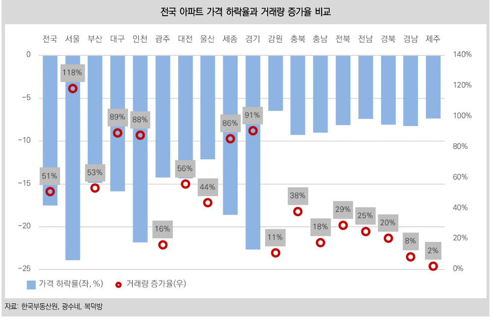 전국 아파트의 가격 하락율과 거래량 증가율을 비교해 보면, 가격이 많이 떨어진 지역일수록 거래량 증가율이 컸다는 것을 알 수 있다.