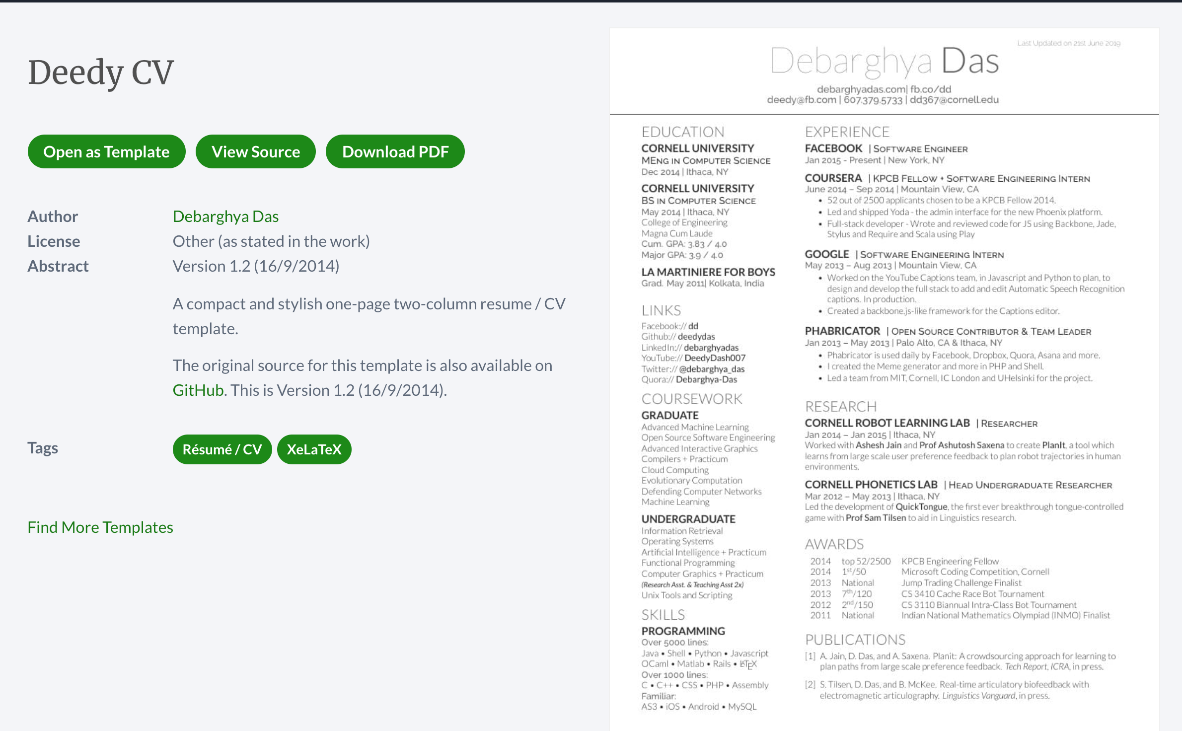 구글에서 latex resume라고 검색하면 CV를 포함한 여러 종류의 template을 찾을 수 있다. 마음에 드는 것을 골라 위와 같이 작성하면 된다.